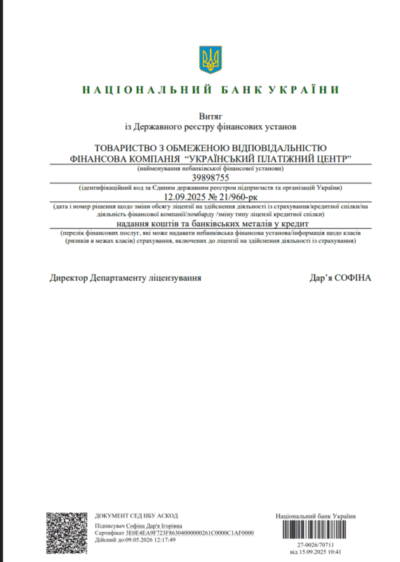 Лицензия НБУ № 21/960-рк от 12.09.2025Отправьте заявку