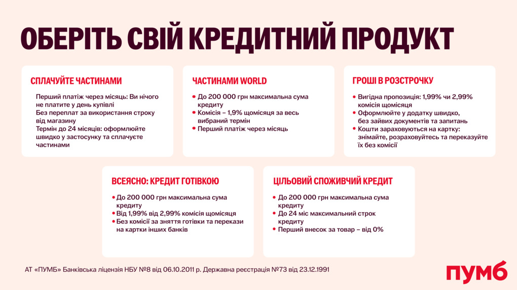Так, один из крупнейших украинских банков ПУМБ предлагает клиентам выгодные кредитные продукты, которые можно легко оформить и управлять через мобильное приложение. Или также легко оформить целевой потребительский кредит в отделениях или экспресс точках за 15 мин. Понятные условия делают кредитные решения от ПУМБ доступными многим клиентам под любые финансовые нужды, подробно с ними можно ознакомиться на сайте банка по этой ссылке.