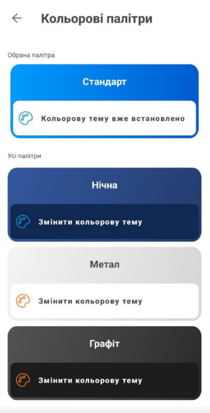 Разработчики уделили внимание и эстетике оформления приложения. Клиент по желанию может выбрать одну из цветовых тем: