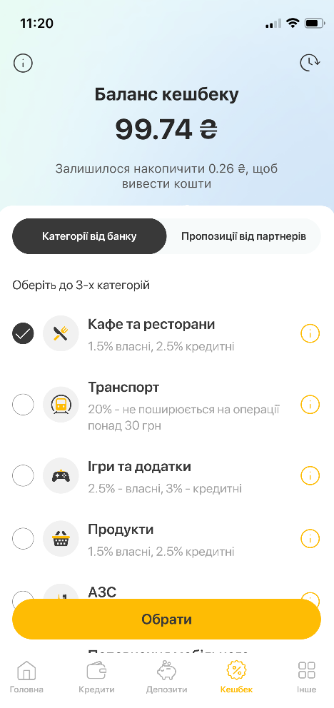 Также есть возможность открыть дополнительные карты: евро, долларовую, дебетную, социальные карты (єВідновлення, єПідтримка, «Национальный кэшбек»). Кстати, банк добавляет еще 10% к сумме, выплаченной в рамках программы «Национальный кэшбек» на счет кешбэка. Кешбэк в мобильном приложении GlobusPlus — это отдельная тема. Банк предлагает выбрать 3 из 8 популярных категорий, в которых насчитывается до 20% кешбэка: