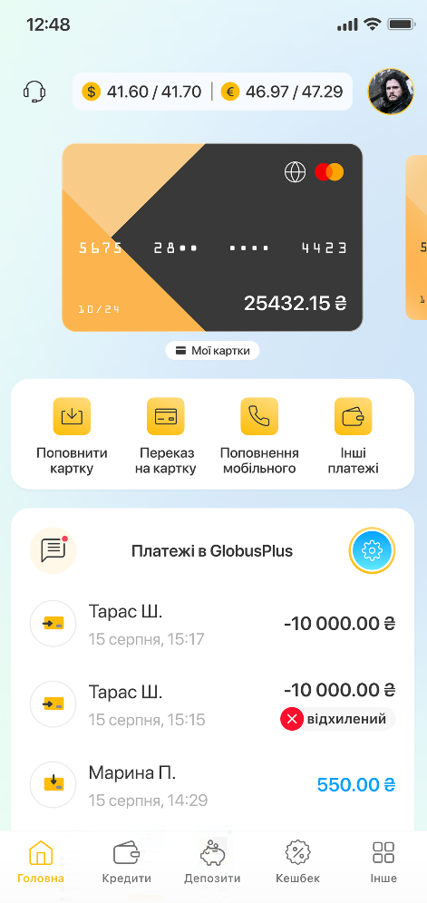 Банк Глобус начисляет кешбэк по оплате не только кредитными, но и собственными средствами. Кроме банковских, также предлагаются десятки предложений и отдельный раздел Персональные предложения, в котором банк предлагает промокоды от партнеров. Также в приложении доступна покупка валюты онлайн по выгодному курсу. Реализована «Плати частями» в известных сетях магазинов.