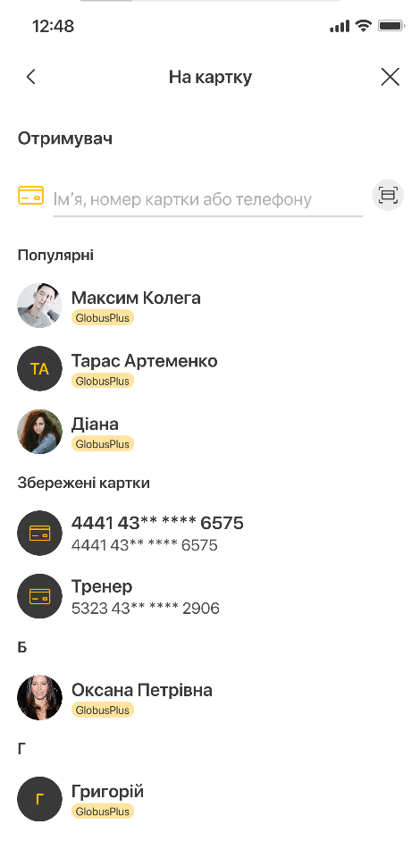 Простые функции реализованы достаточно удобно для пользователей. Вот как, например, смотрится экран перевода на другую карту. Можно ввести не только номер карты, но и номер телефона получателя (если он есть в телефонной книге клиента) или вообще его имя, а также добавить комментарий к платежу: