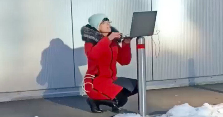 Учительница проводит онлайн занятие во время отключений электроэнергии в Украине, сидя на корточках на улице. Киев, декабрь 2022 года. Фото из открытых источников