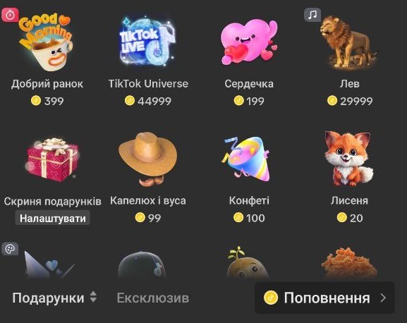Например, самые популярные гифты – роза, мороженое, логотип TikTok, GG (отсюда и икание) стоят 1 монету, но есть и такие, стоимость которых исчисляется тысячами монет.
