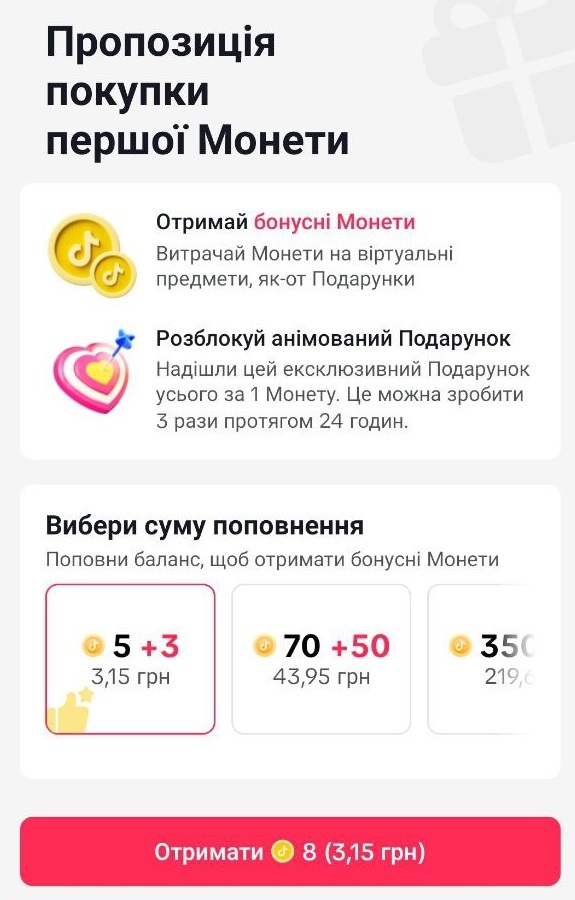 Виртуальные монеты приобретаются за реальные деньги. Сейчас TikTok предлагает приобрести 8 монет (5+3) всего за 3,15 грн. В среднем одна монета стоит около 1,5 цента.