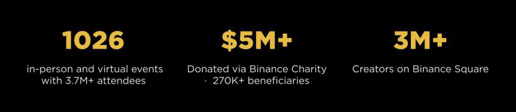 В 2025 году, согласно отчету, Binance провела 1 026 офлайн- и онлайн-мероприятий с 3,7 млн+ участников. Отдельно приведены детали: 553 офлайн-встречи и мероприятия собрали почти 520 000 участников, 473 виртуальных события — 3,2 млн участников; социальные аккаунты Binance достигли 25 млн подписчиков.