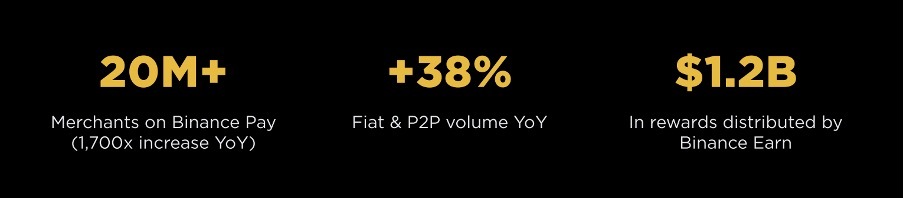 О Binance Pay отмечено: количество пользователей выросло на 30% год к году, а количество мерчантов увеличилось примерно с 12 000 до более чем 20 млн. В совокупности Binance Pay обработал более $280 млрд транзакций с момента запуска в 2021 году; при этом более 98% B2C-платежей в 2025 году были рассчитаны в стейблкоинах.