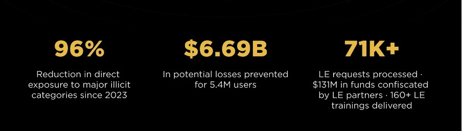 Один из самых «проверяемых» блоков отчета — метрики безопасности и комплаенса. Сообщается, что с 2023 года Binance сократила прямую экспозицию к ключевым категориям нелегитимных средств на 96%. В 2025 году контролями было предотвращено $6,69 млрд потенциальных потерь от мошенничества и скамов для 5,4 млн пользователей.