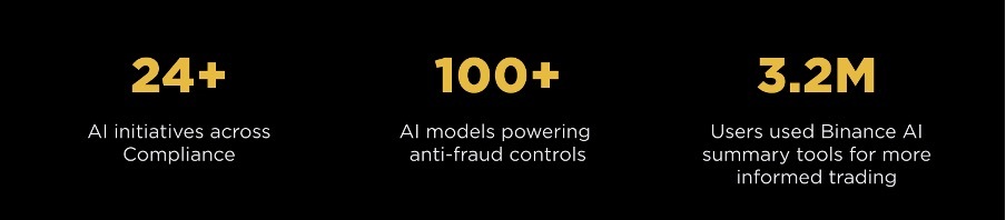 В 2025 году, согласно отчету, AI в Binance стал не «дополнением», а частью базовой инфраструктуры — с акцентом на управление рисками и формальную governance-модель. Отмечено, что было развернуто 24+ AI-инициативы в комплаенсе, а в антифрод/антискам-контролях работают 100+ AI-моделей. Эти системы принимают более 80% решений и помогают примерно в 45% рабочих процессов, связанных с ручной проверкой. Для пользователей отмечается запуск AI token reports и summary-инструментов: ими воспользовались 3,2 млн пользователей в 2025 году.