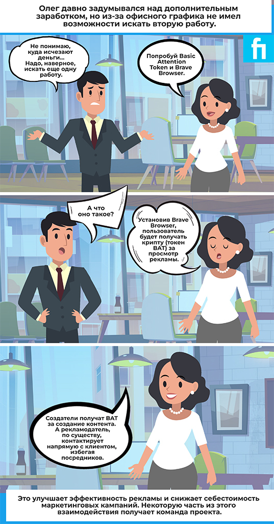 Создатели получат BAT за создание контента. А рекламодатель, по сути, контактирует напрямую с клиентом, избегая посредников. Это улучшает эффективность рекламы и снижает себестоимость маркетинговых компаний. Определенную часть из этого взаимодействия получает команда проекта.