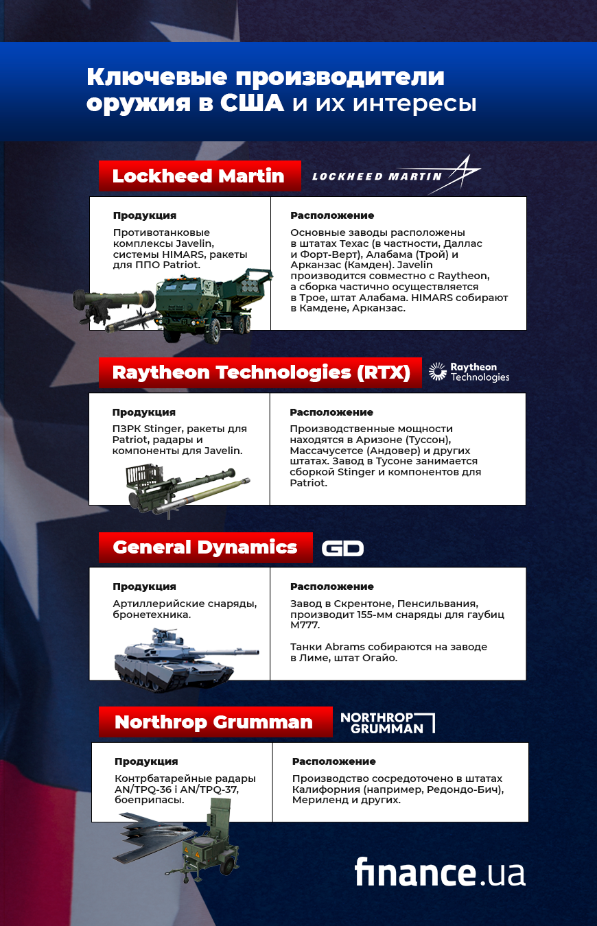 По словам Ивана Уса, экономиста и главного консультанта Центра внешнеполитических исследований Национального института стратегических исследований, военная помощь США Украине оказывает значительное влияние на американские военные компании, которые выиграют от этого процесса.