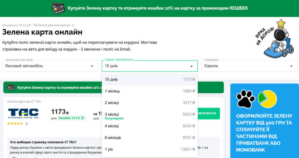 Напоминаем, помочь приобрести вам «Зеленую карту» может и Finance.ua. У нас можно оформить полис онлайн до пяти минут. Отметим, что в случае покупки «Зеленой карты» через Finance.ua вы получаете кэшбек на карту в размере 10% от стоимости полиса по промокоду «КЕШБЕК».