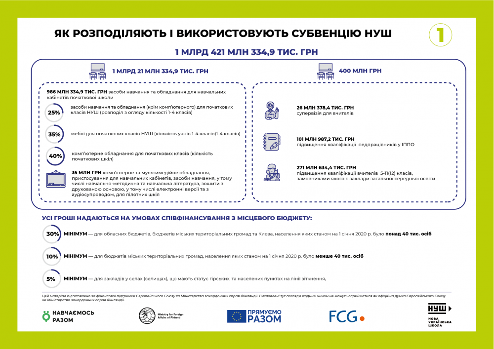 - Как распределяют и используют субвенцию НУШ в 2021. Инфографика — все, на что выделены государством средства: сколько средств выделено, на что и сколько получит каждая область. Важно, что это постановление предусматривает дофинансирование из местных бюджетов.
