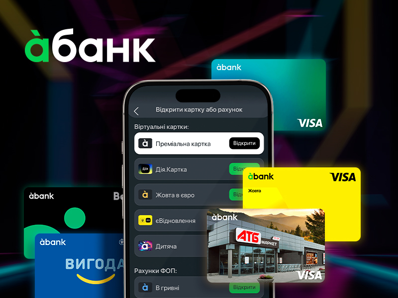 На відміну від багатьох банків, у яких пропозиція віртуальних карток обмежується одним-двома продуктами, abank пропонує їх декілька видів. Це віртуальні дебетові та кредитні картки: Bolt, АТБ, Вигода (Епіцентр), єПідтримка, єВідновлення, Дія. Картка, Жовта.