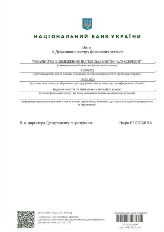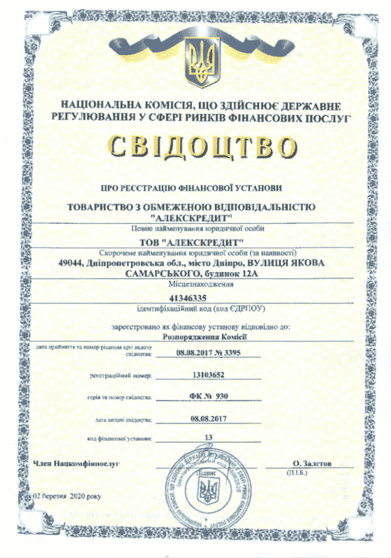 AlexCredit – організація в сфері мікрокредитування. Свідоцтво про реєстрацію було отримано компанією в серпні 2017 року. МФО надає послуги на території України. Одне з ключових відмінностей фірми від банківських організацій – відсутність паперової тяганини при оформленні онлайн позики.
