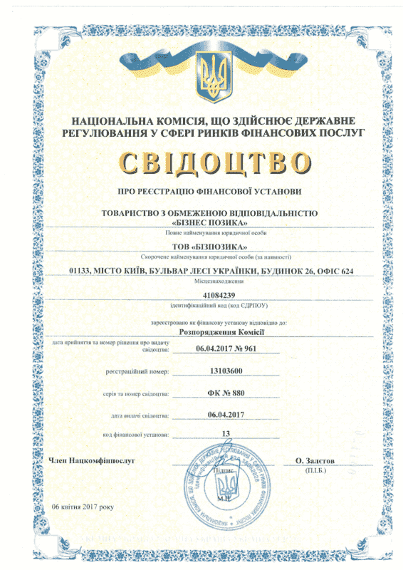 Свідоцтво ФК №880 від 06.04.2017Надішліть заявку