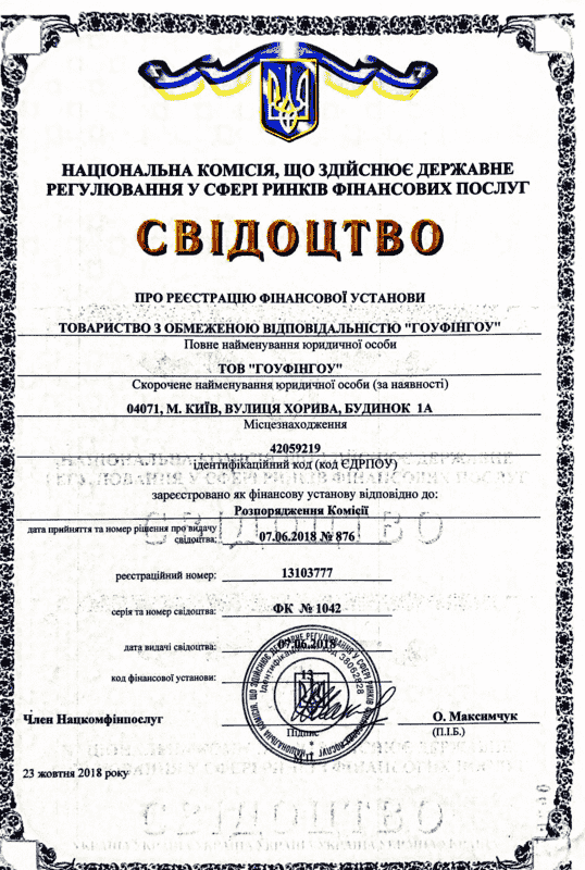 Свідоцтво ФК №1042 від 07.06.2018Надішліть заявку