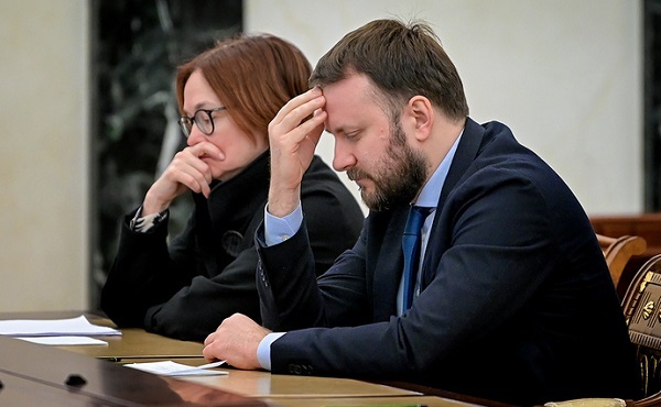 Голова Центробанку рф Ельвіра Набіулліна та помічник президента рф Максим Орєшкін під час наради з володимиром путіним з економічних питань у кремлі, 28 лютого. Фото: ТАСС