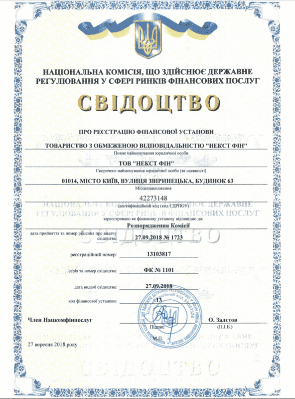 Свідоцтво ФК № 1101 від 27.09.2018Надішліть заявку