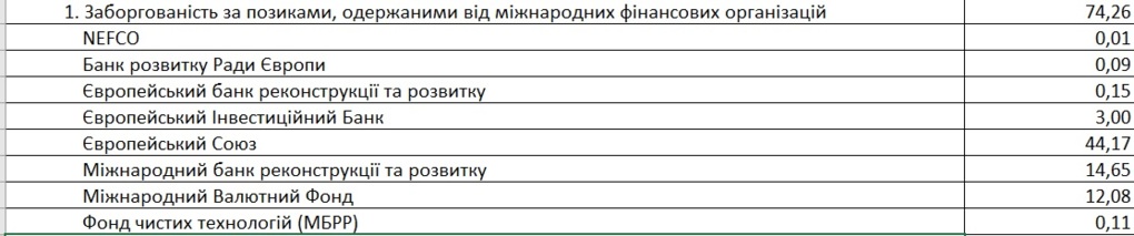 Якщо говорити про структуру цього боргу в абсолютних цифрах, то міжнародним фінансовим організаціям Україна заборгувала 74,26 млрд доларів.