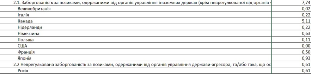 Щодо урядів іноземних держав, то ми їм винні загалом 7,74 млрд доларів. Найбільше Україна заборгувала Канаді — 5,11 млрд доларів.