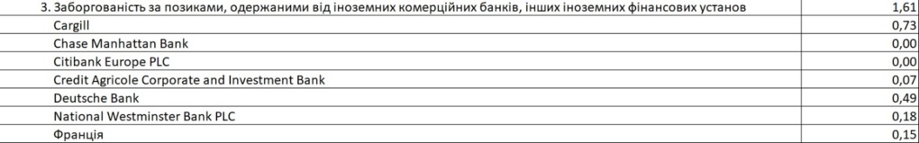 Ще 1,61 млрд Україна винна іноземним банкам та фінансовим установам. Найбільше — американській продовольчій компанії Cargill Inc. (730 млн доларів) та Deutsche bank — 490 млн доларів.