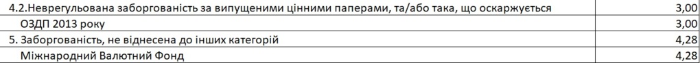 За ОЗДП Україна заборгувала 15,22 млрд доларів, причому це облігації, випущені 2024 року, за попередні роки боргів немає, крім боргу за 2013 рік у 3 млрд доларів, який є неврегульованим та оскаржується Україною у міжнародних інституціях. Також окремим рядком Мінфін подає ще один борг перед МВФ — 4,28 млрд, однак чому цей борг не враховано до загального боргу перед Фондом, не пояснюється.