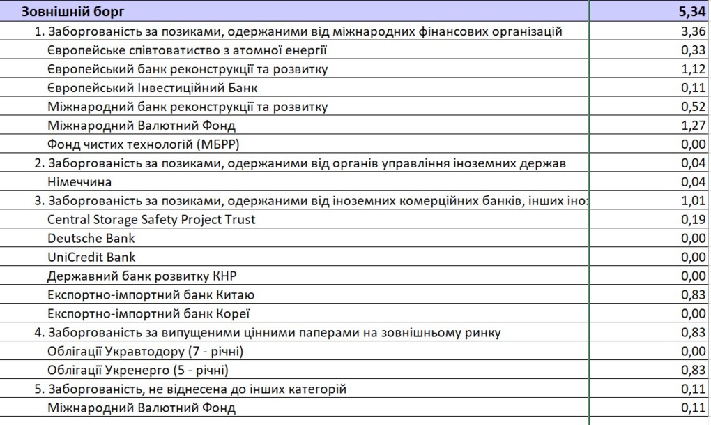 Найбільшими кредиторами, як уже зазначалося, є міжнародні фінансові організації та уряди іноземних держав. Станом на кінець вересня ми винні їм загалом 112,06 млрд доларів: 106,72 млрд доларів державного боргу і 5,34 млрд гарантованого державою боргу.
