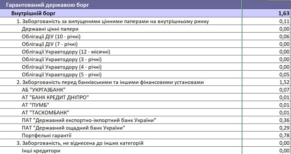 Гарантований державною внутрішній борг становить, як уже зазначалося, 1,63 млрд доларів і має такий вигляд: