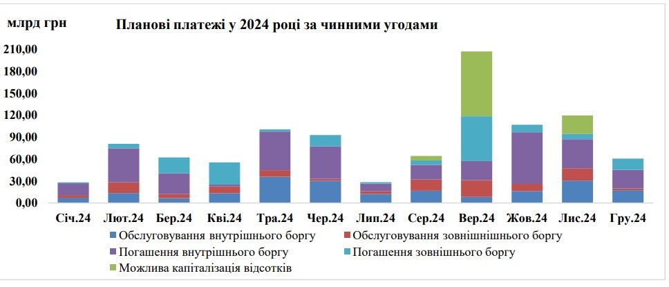 Пікові платежі за внутрішнім державним боргом припадають на лютий, травень, червень, вересень, жовтень та листопад 2024 року; за зовнішнім — на березень (погашення кредиту МВФ), квітень (погашення позики ЄС) та вересень (погашення та сплата відстрочених у рамках операції з управління державним боргом у серпні 2022 року відсотків за ОЗДП 2015 року).