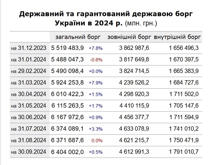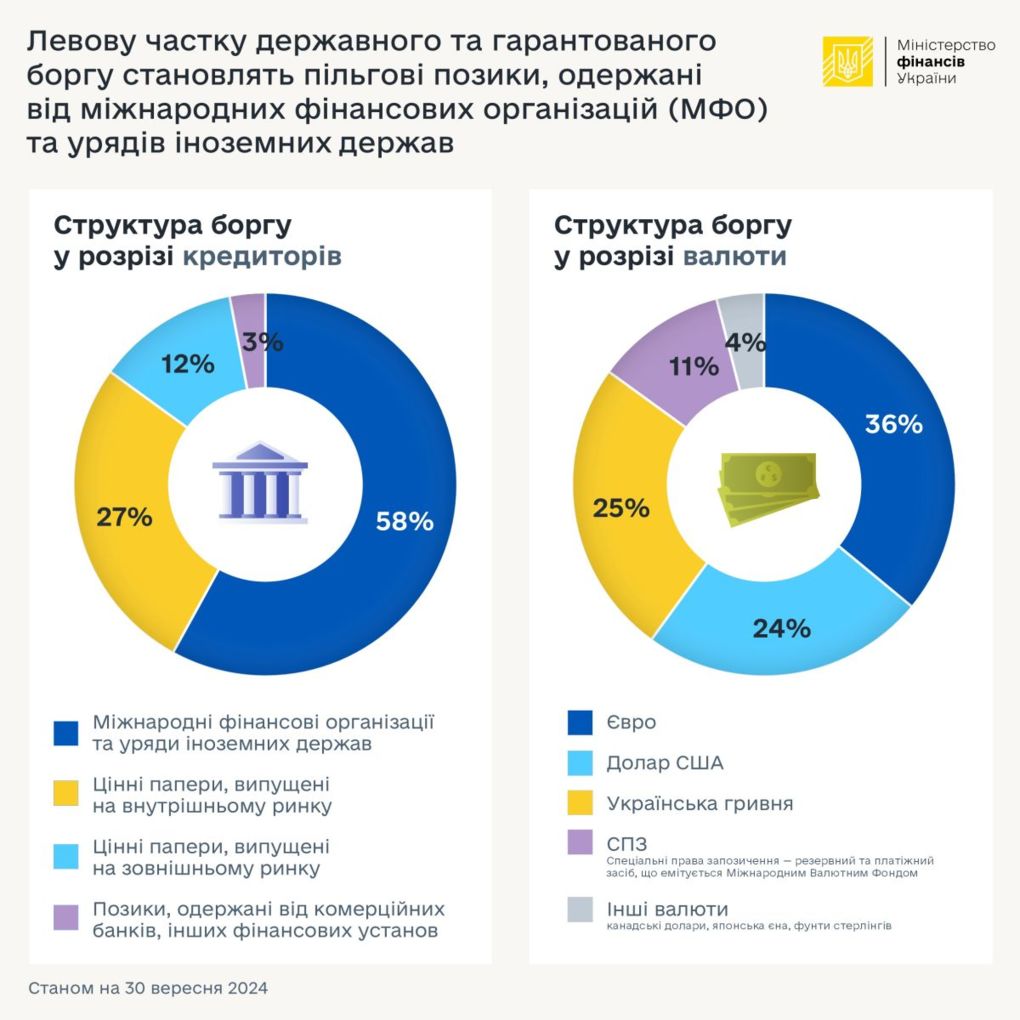 Як повідомляв Мінфін, станом на 30 вересня 2024 року загальний державний борг України становив 6 трлн 409 млрд гривень, або 155,69 млрд доларів. Він включає як зовнішні, так і внутрішні запозичення і розподіляється наступним чином: зовнішній борг — 4 трлн 613 млрд гривень (72% загальної суми державного та гарантованого державою боргу), або 112,1 млрд доларів; внутрішній борг — 1 трлн 796 млрд гривень (28%) або 43,6 млрд доларів.