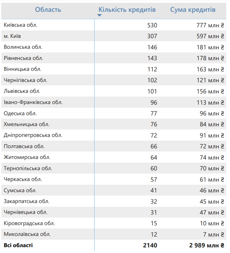 Статистика виданих кредитів і їхні суми за регіонами станом на 26.07.2023. Джерело: Укрфінжитло