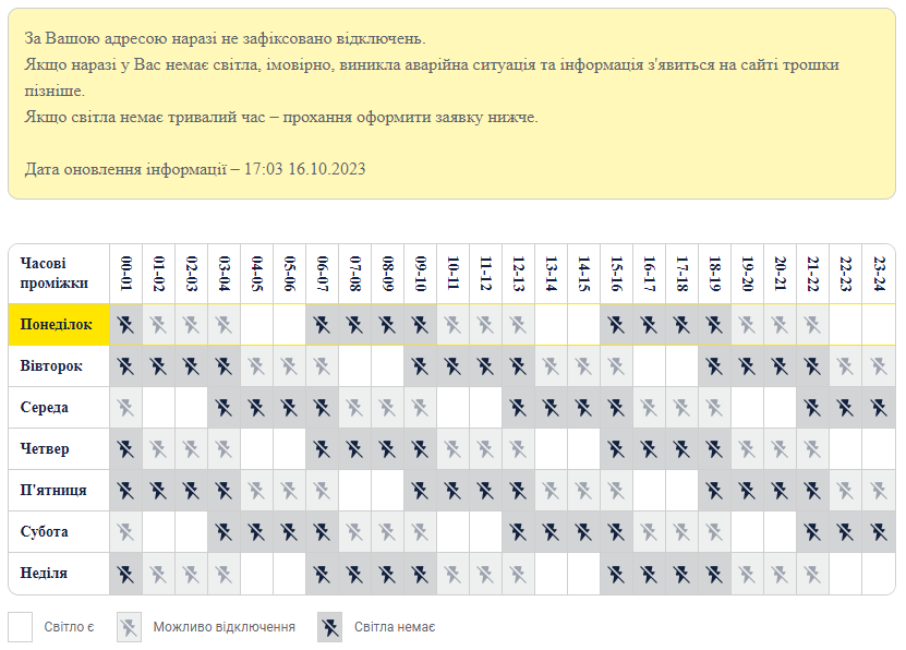Проте найвірогідніше графіки відключень уже є. Це скриншот із сайту ДТЕК по одній із київських адрес. Якщо вірити наведеній таблиці, світло в разі потреби вимикатимуть на чотири години кілька разів на добу: