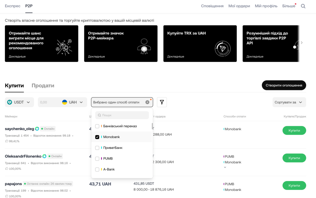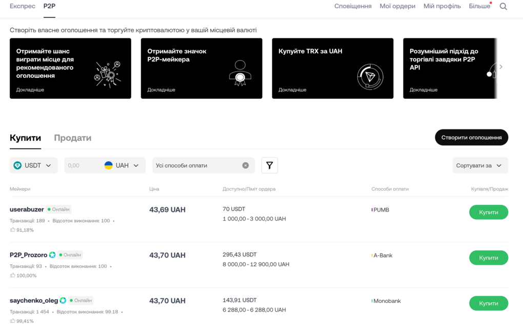На платформі одразу видно перелік пропозицій з ціною, лімітами та способами оплати. Під час купівлі варто звернути увагу на надійність продавця (мейкера) ― кількість транзакцій і відсоток виконання.