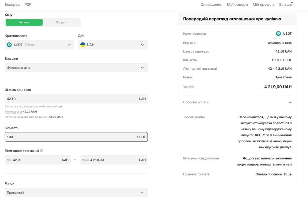 Щоб купити криптовалюту на OKX P2P, виконайте наступні дії:
