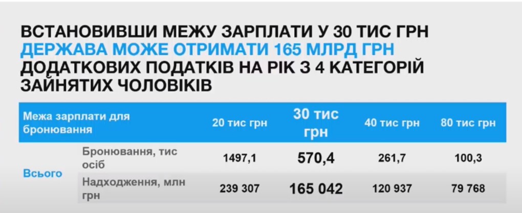 У випадку, якщо Парламент врахує побажання Офісу президента і необхідним порогом для відстрочки буде заробітна плата у 30 тисяч гривень, то, за розрахунками голови Advanter Group Андрія Длігача, це дасть можливість «забронювати 570 тисяч працівників, критичних для бізнесу, та збільшити надходження до держбюджету на 165 мільярдів гривень».
