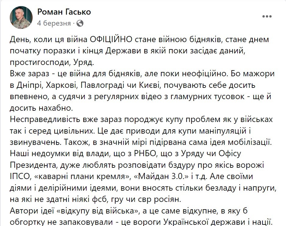 «День, коли ця війна офіційно стане війною бідняків, стане днем початку поразки та кінця Держави в якій поки засідає даний, прости Господи, уряд. Вже зараз – це війна для бідняків, але поки неофіційно. Бо мажори в Дніпрі, Харкові, Павлограді чи Києві, почувають себе досить впевнено, а судячи з регулярних відео з гламурних тусовок – ще й досить нахабно», – застерігає офіцер ЗСУ Роман Гасько.