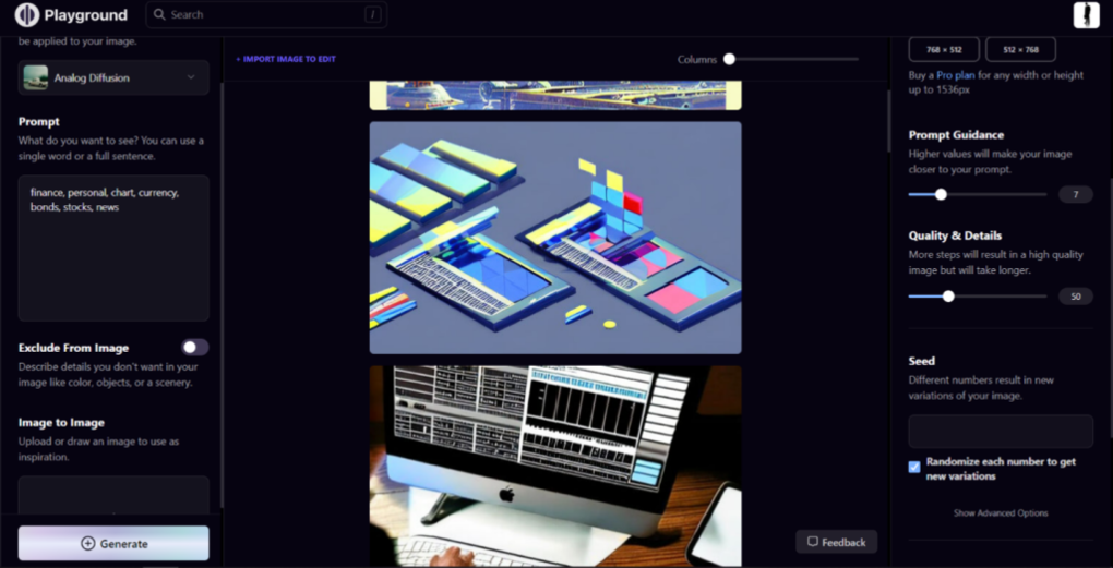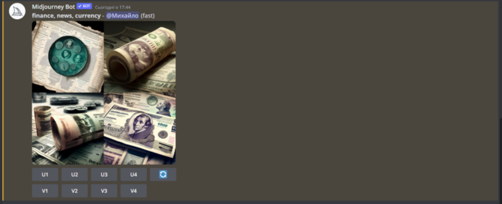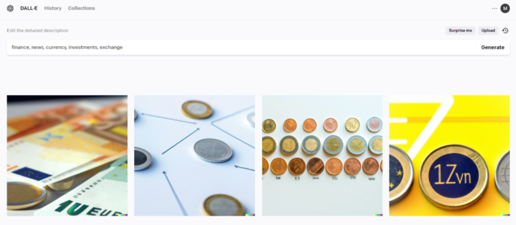 Використовуючи набір ключових слів «finance, personal, chart, currency, bonds, stocks, news» ми згенерували доволі цікаві і якісні зображення витративши на їх створення всього декілька хвилин.