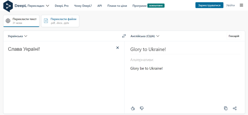 Один із таких deepl. Працює він по загально знайомому принципу – вносимо текст, отримуємо переклад. Також вміє він працювати з файлами pdf, docx, pptx. Результат його роботи в 3 рази кращий ніж у звичайного перекладача.
