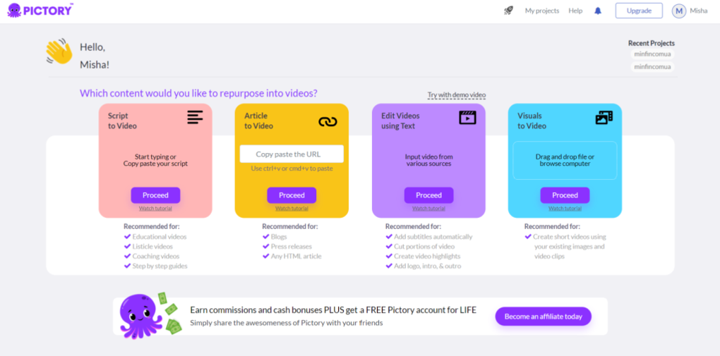 Для того, щоб користуватися pictory, вам потрібно зареєструватися на сайті pictory.ai. Після реєстрація можна переходити до роботи з відео. Створюєте новий проєкт та обираєте тип контенту: текст, аудіо чи відео. Потім завантажуєте свій контент (це не обов’язково, платформа має безліч готових шаблонів. – Ред.) або копіюєте його з іншого джерела.