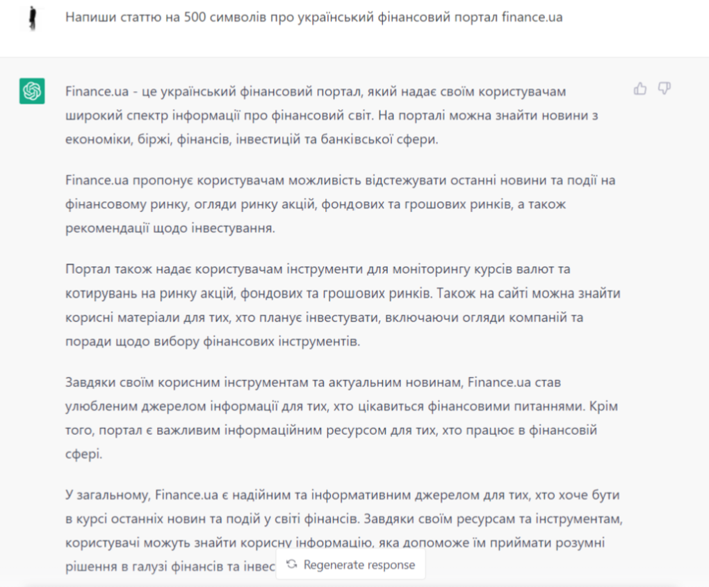 Ми попросили ChatGPT написати коротеньку статтю про Finance.ua. Ось, що вийшло. Витрати часу не перевищили 20 секунд.