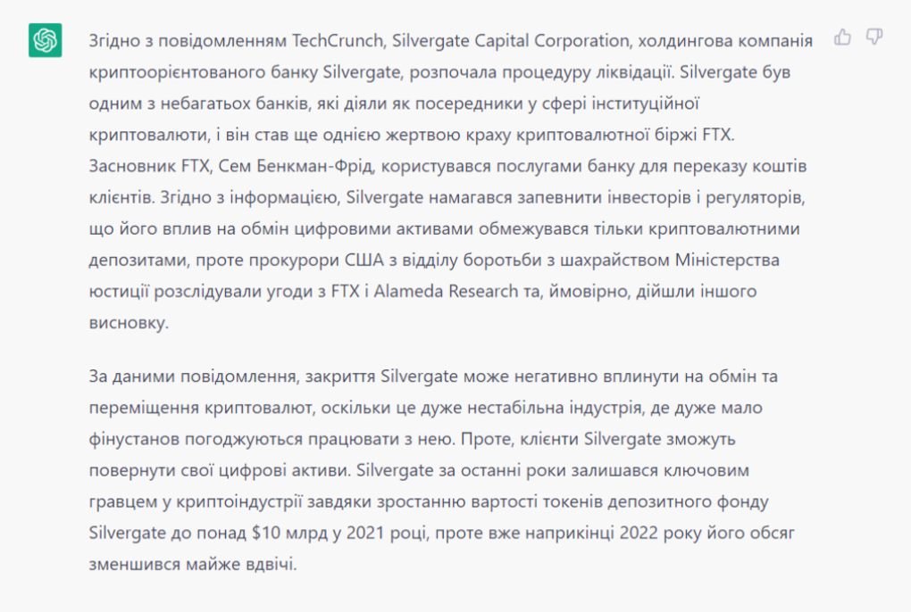 Далі ми попросили ChatGPT зробити рерайт новини опублікованої на порталі. Через декілька секунд завдання було виконано.