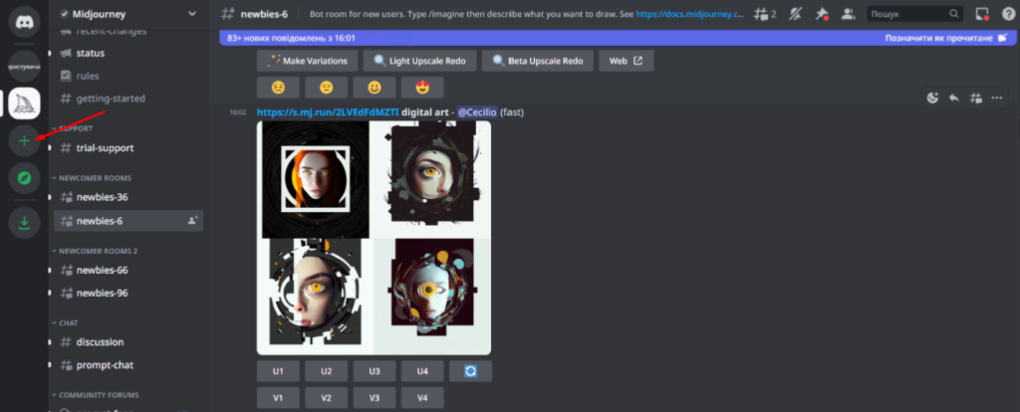 Після того, як ви створите свою першу ілюстрацію ШІ запропонує вам яке зображення збільшити (U1, U2, U3, U4), а з якого зробити ще 4 варіанти (V1, V2, V3, V4).