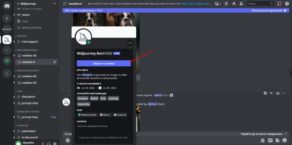 Після того як бота додано в нашу кімнату ми можемо перейти до генерації зображень. Набираємо в чаті «/imagine» і додаємо опис зображення яке хочемо отримати.