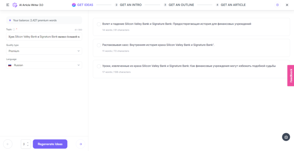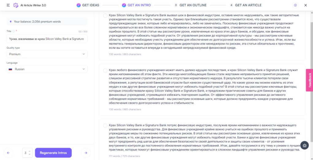 2. Обираємо один із запропонованих варіантів, після чого штучний інтелект генерує 3 альтернативні вступні тексти. Ми також вибираємо один із них.
