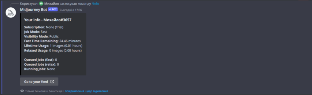 Безкоштовно попрацювати з Midjourney можна всього 25 хв. Це час витрачений на створення тієї чи іншої ілюстрації, не плутати із загальним часом. Після закінчення часу, доступ буде можливий тільки на платній основі. Для перевірки часу використання вводимо /info та отримуємо всю інформацію по використанню Midjourney.