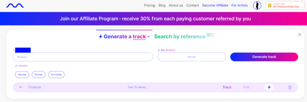 Потім оберіть параметри майбутнього треку: жанр, настрій, темп та тривалість. Натискайте кнопку «Generate track» та чекайте кілька секунд.