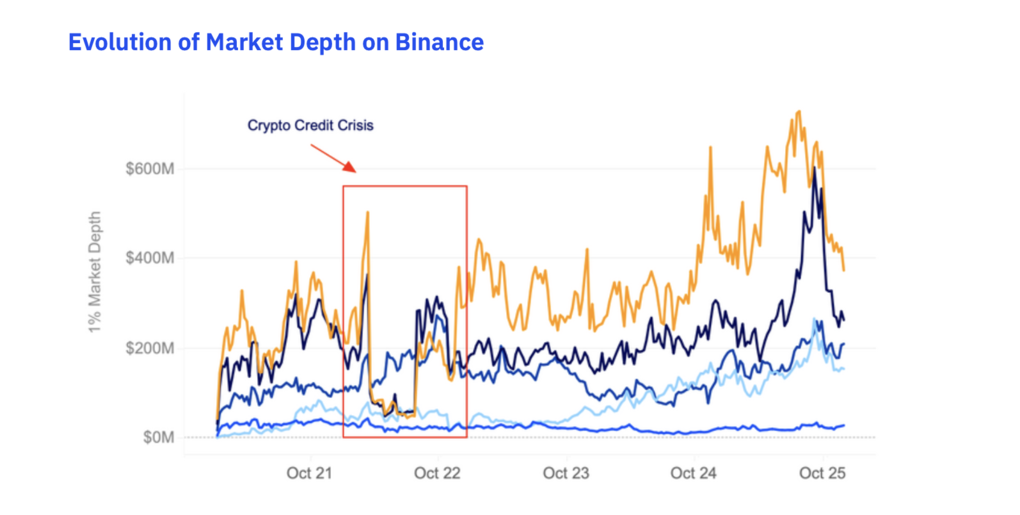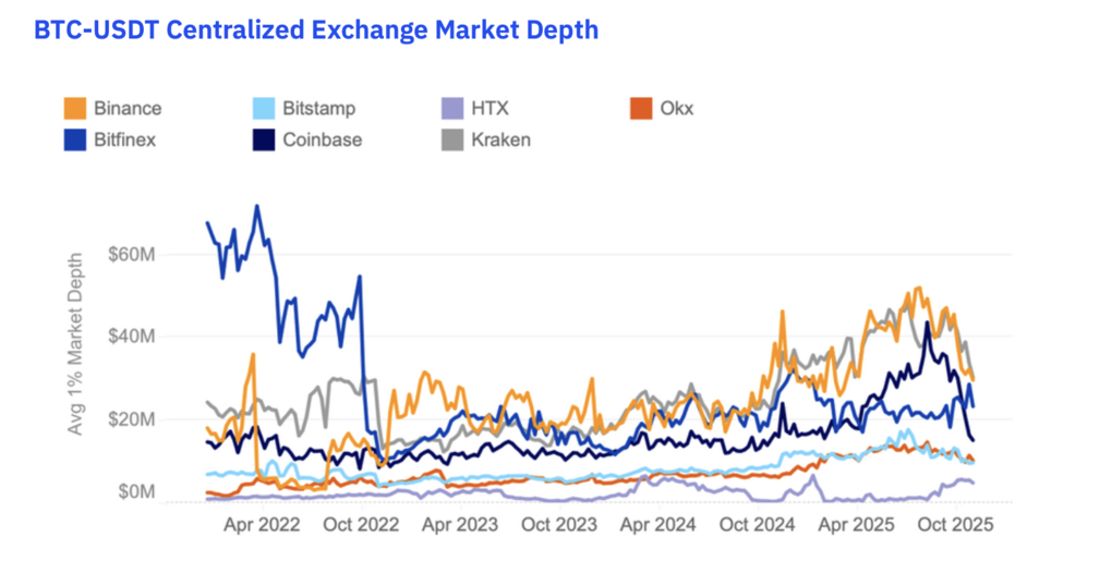 Ба більше, звіт трактує зростання цієї метрики як ознаку структурного дорослішання ринку. За даними Kaiko, до жовтня 2025 року 1%-глибина за BTC на Binance перевищувала $600 млн — рівень вищий за максимуми, що спостерігалися до стресів 2022 року. Це важливий сигнал: ліквідність стає не лише циклічною (зростає на підйомі), а й стійкою (повертається після шоків).