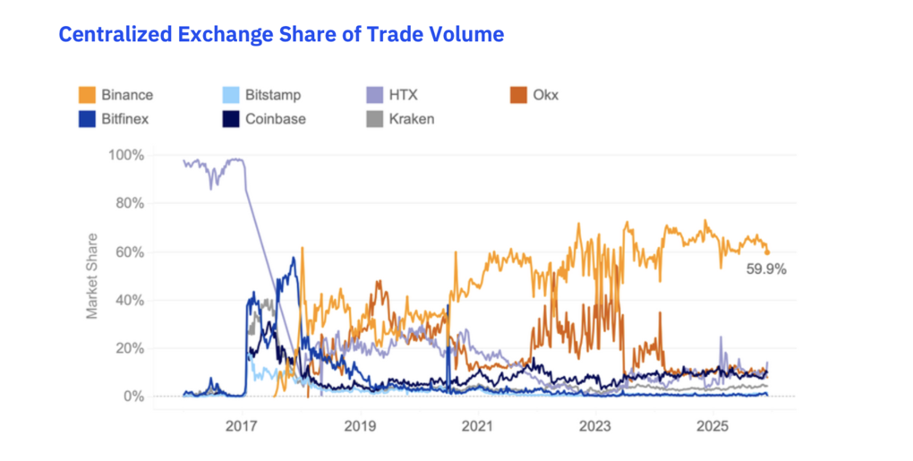 Всередині обігу звіт фіксує характерний розподіл: на Binance на BTC припадало близько 28,6% спотового обсягу, на ETH — близько 22%, за помітної ротації інтересу в SOL і низці інших великих активів.