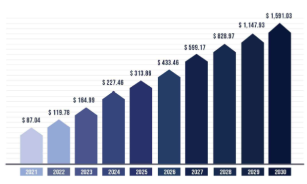 Очікується, що він досягне значень вище півтора трильйона доларів до 2030 року, показуючи щорічне зростання в розмірі 38,1%, згідно з даними Precedence Research.